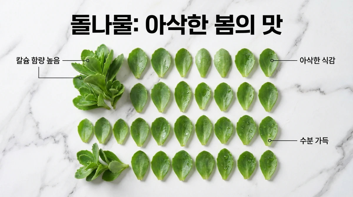 돌나물은 수분이 많고 아삭한 식감으로 봄철 입맛을 돋우는 데 좋습니다. 칼슘 함량이 우유보다 높고, 비타민 C도 풍부하여 골다공증 예방과 피부 미용에 탁월한 효과를 보인답니다. 새콤달콤한 양념에 무쳐 먹으면 다른 반찬이 필요 없을 정도예요.