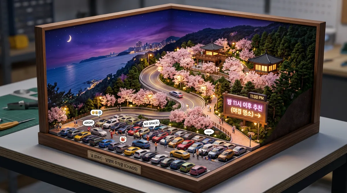해 질 녘에 맞춰가면 핑크빛 하늘과 벚꽃이 어우러져서 말로 표현 못 할 장관을 이룹니다. 저도 몇 년 전까진 무조건 차를 끌고 갔는데, 한 번 걸어서 올라가 본 뒤로는 절대 차 안 가져갑니다. 주변에 주차비도 비싸고 길도 좁아서 초보 운전자라면 특히 더 조심하셔야 해요.