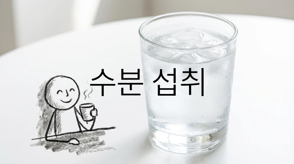 - 충분한 수분 섭취: 몸 전체의 신진대사와 눈 건강에 도움이 됩니다. 하루 8잔 이상의 물을 마시는 것을 권장해요.