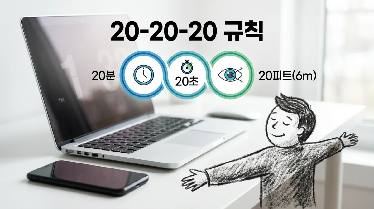 - 규칙적인 눈 휴식: 컴퓨터나 스마트폰 사용 시 20-20-20 규칙 (20분마다 20초간 20피트(약 6미터) 거리 보기)을 실천하여 눈의 피로를 덜어주세요.