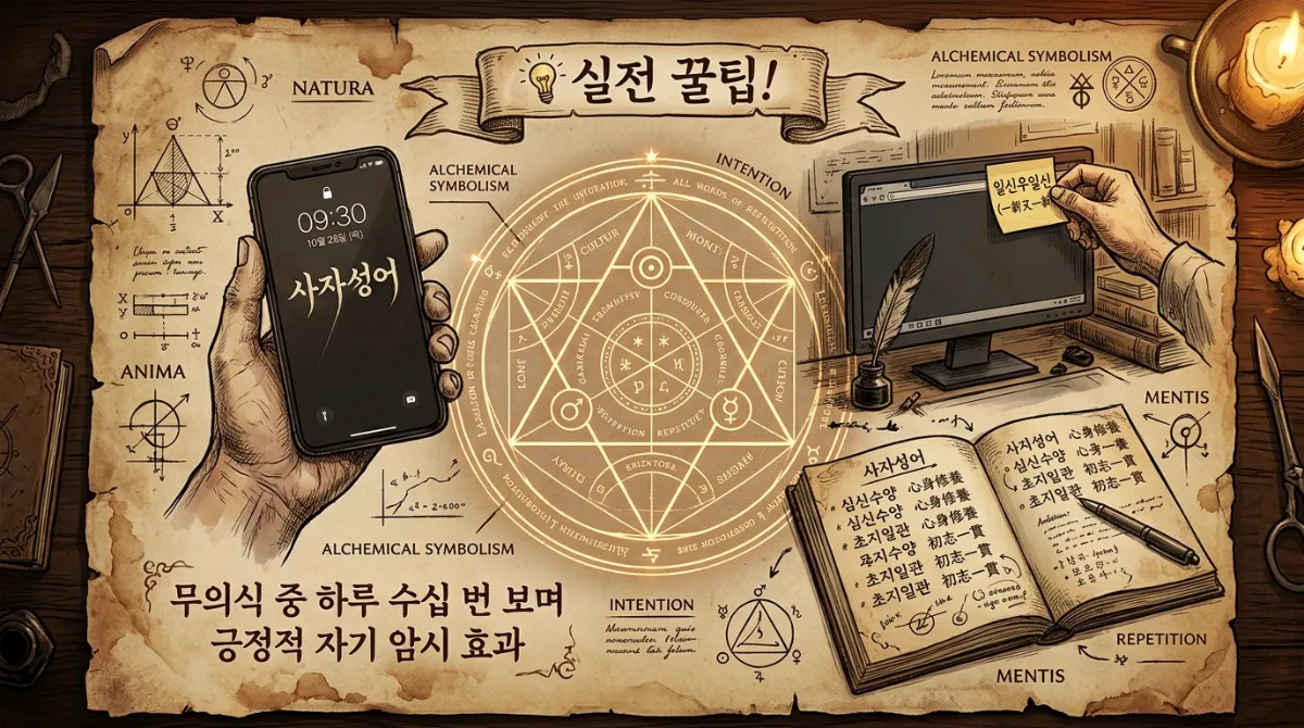 마음에 드는 사자성어를 찾았다면, 스마트폰 잠금 화면이나 포스트잇에 적어 모니터 옆에 붙여두세요. 무의식 중에 하루에도 수십 번씩 보게 되며 긍정적인 자기 암시 효과를 얻을 수 있습니다.
