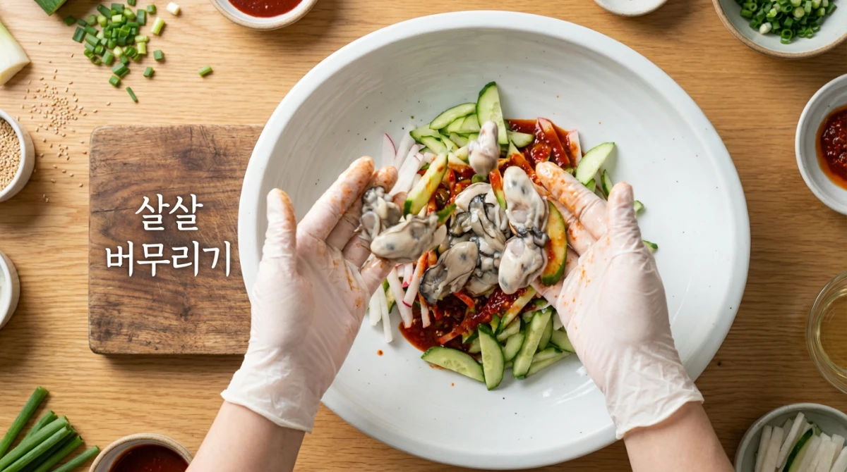 - 4. 부드럽게 버무리기: 굴이 터지지 않도록 살살, 뒤섞듯이 버무리는 것이 아삭한 식감 유지의 비결입니다.