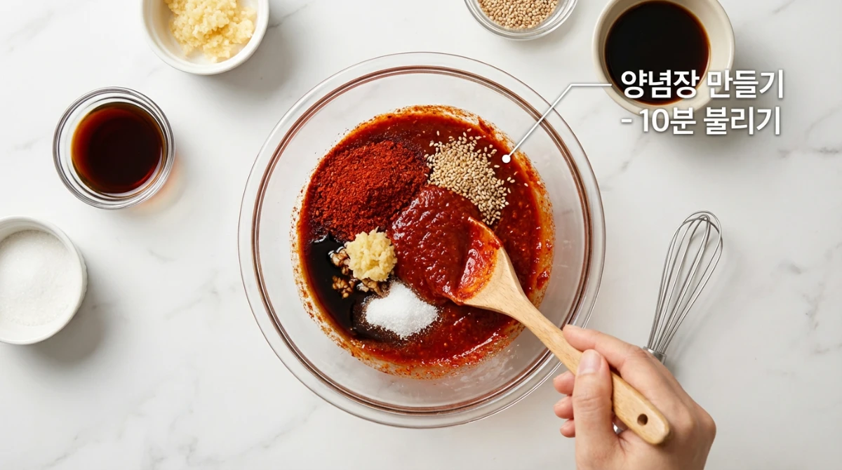 - 2. 양념장 만들기: 위의 양념 재료를 모두 섞어 양념장을 만듭니다. 고춧가루는 미리 양념에 넣어 불려두면 색깔이 더 예쁘고 맛도 깊어져요. 저는 보통 10분 정도 미리 섞어둡니다.