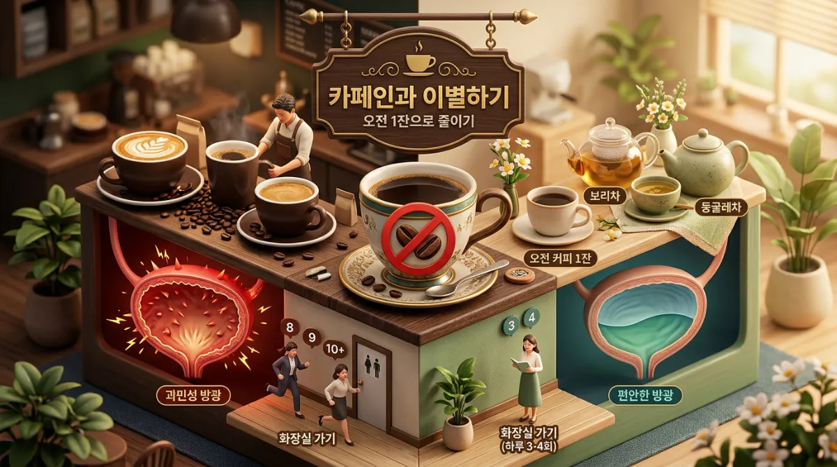 그리고 카페인 섭취를 조절했습니다.하루 3잔씩 마시던 커피를 오전 1잔으로 줄이고, 오후에는 따뜻한 차 종류로 바꿔보았죠. 확실히 저녁에 화장실을 찾는 횟수가 줄어드는 것을 경험했습니다. 커피가 방광을 자극한다는 말이 제 몸에서도 증명된 셈입니다.