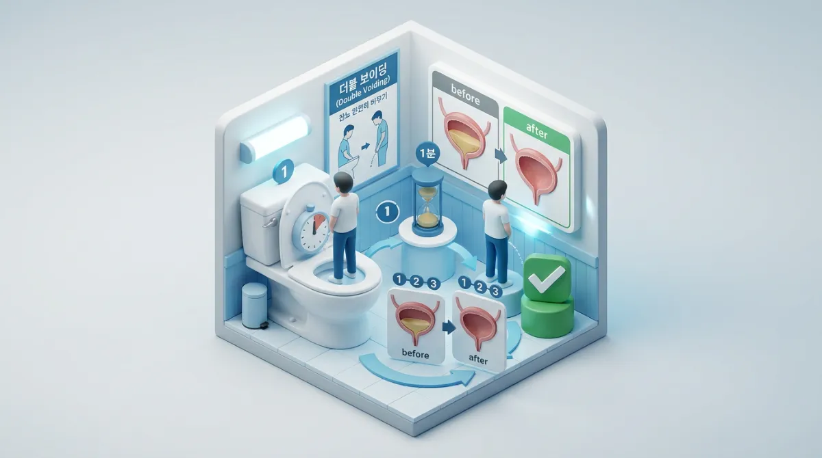 화장실에서 소변을 본 뒤, 약 1분 정도 기다렸다가 다시 한 번 배뇨를 시도해 보세요. 방광에 남은 잔뇨를 비워줌으로써 다시 화장실을 찾게 되는 간격을 늘리는 데 도움이 될 수 있습니다.