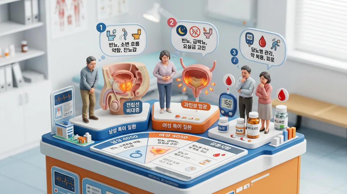| 남성 (4050) | 전립선 비대증 등 | 소변 줄기가 가늘어짐, 잔뇨감 |