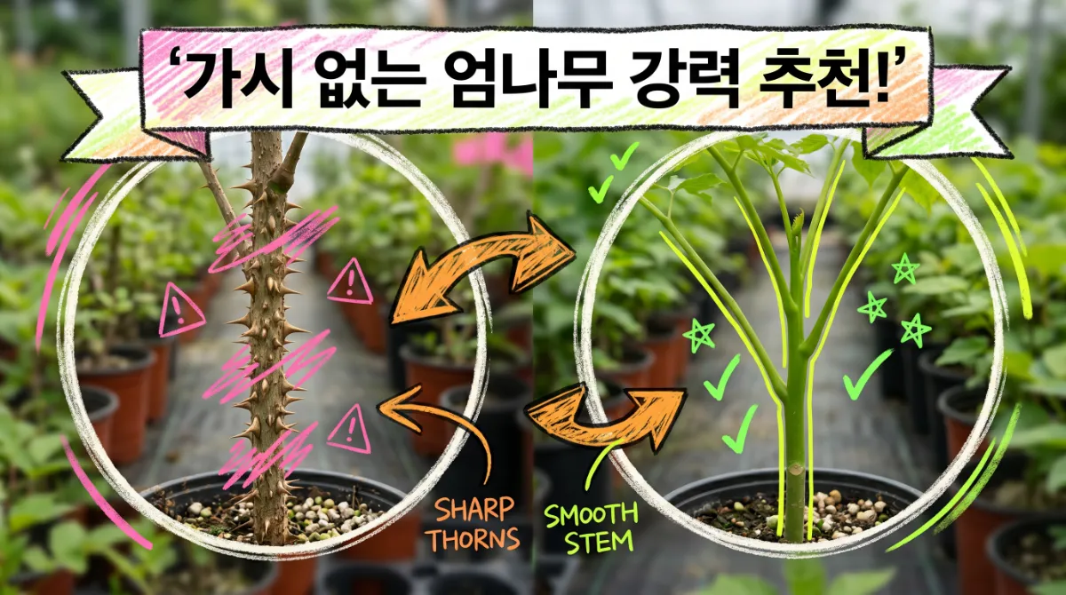 초보 재배자의 경우 수확 및 관리 시 부상의 위험이 적고 작업 속도가 빠른 가시 없는 엄나무(민엄나무)를 선택하는 것이 유리합니다. 야생종 특유의 풍미를 중시한다면 일반 재래종을 선택할 수 있습니다.