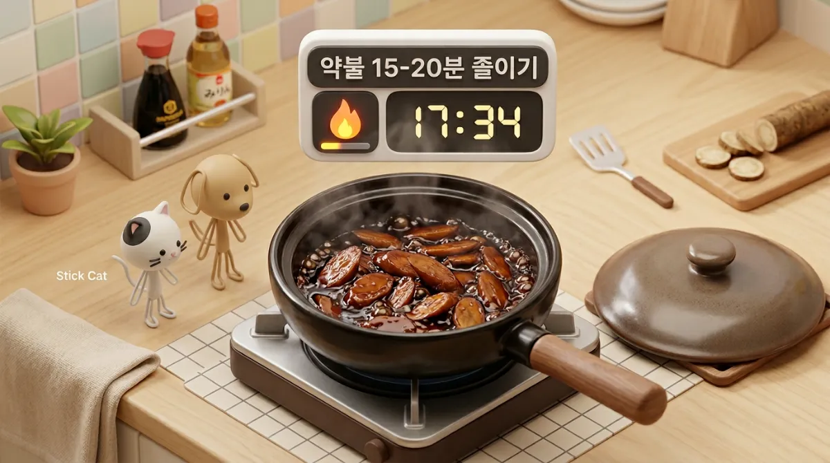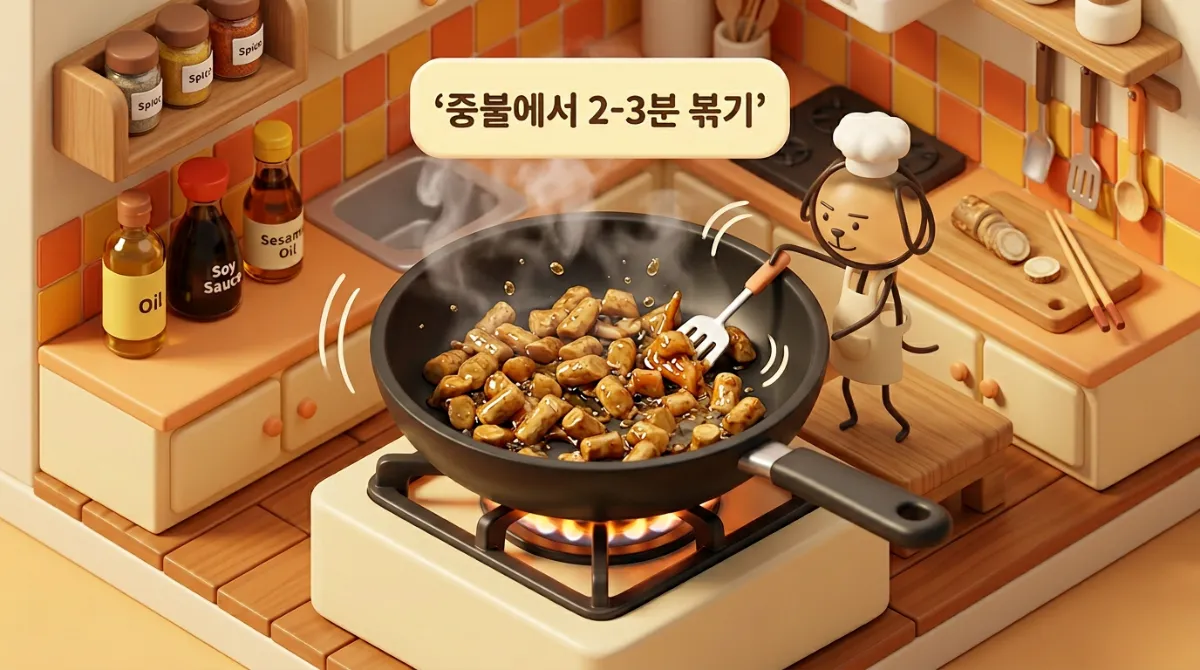 마지막에 윤기를 내기 위한 조청이나 올리고당 2큰술은 따로 빼두세요. 처음부터 넣으면 우엉이 질겨질 수 있으니 마지막 단계에서 넣는 것이 핵심입니다. 여기에 다진 마늘 0.5큰술을 추가하면 풍미가 한층 살아납니다.