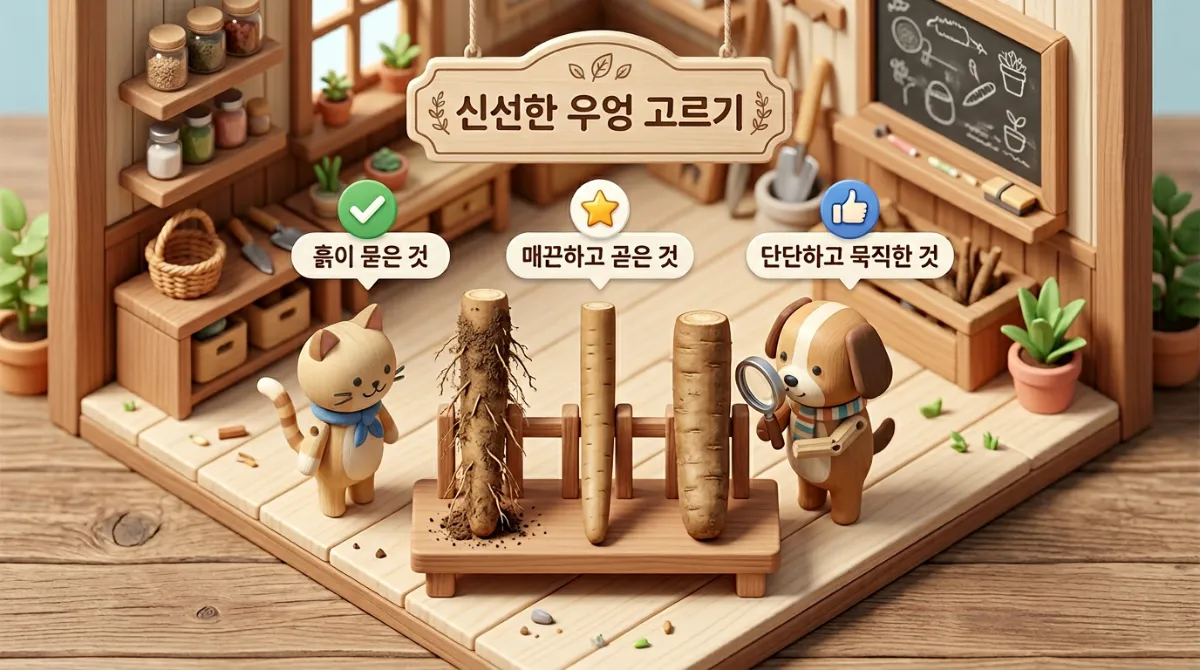 너무 굵은 것보다는 직경 2cm 정도의 매끄러운 우엉을 선택하세요. 너무 굵으면 속이 비어 있거나 심이 박혀 식감이 질길 수 있거든요.