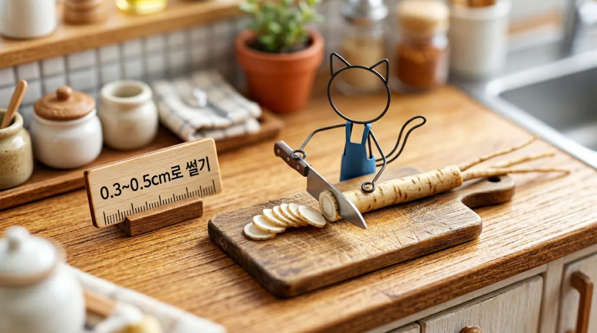 여기서 가장 중요한 포인트! **절대 껍질을 필러로 깎아내지 마세요.** 우엉 껍질에는 '사포닌'이라는 핵심 영양소가 듬뿍 들어있거든요.