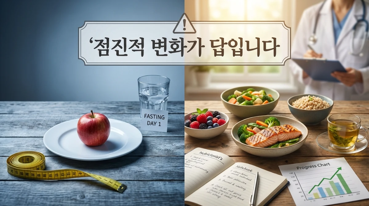 갑작스럽고 극단적인 식단 변화는 오히려 건강에 해로울 수 있습니다. 서서히 건강한 식단으로 바꾸어 나가고, 필요한 경우 전문가와 상담하여 자신에게 맞는 계획을 세우는 것이 중요합니다.