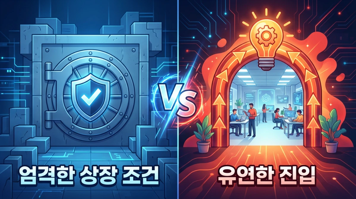 | 상장 조건 | 엄격 (자본금, 매출, 이익 등) | 상대적으로 유연 (기술 성장 특례 등) |
