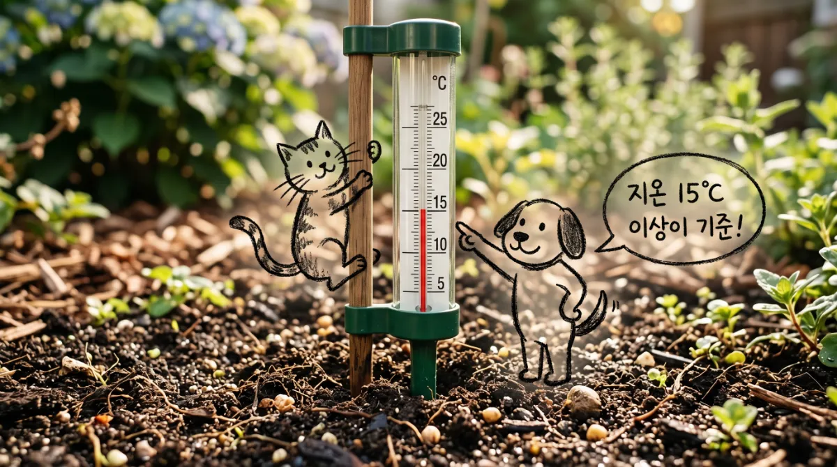 지온이 15°C 이상 안정되는 시점이 기준입니다. 너무 이르면 싹이 트기 전에 씨앗이 썩어버려요.