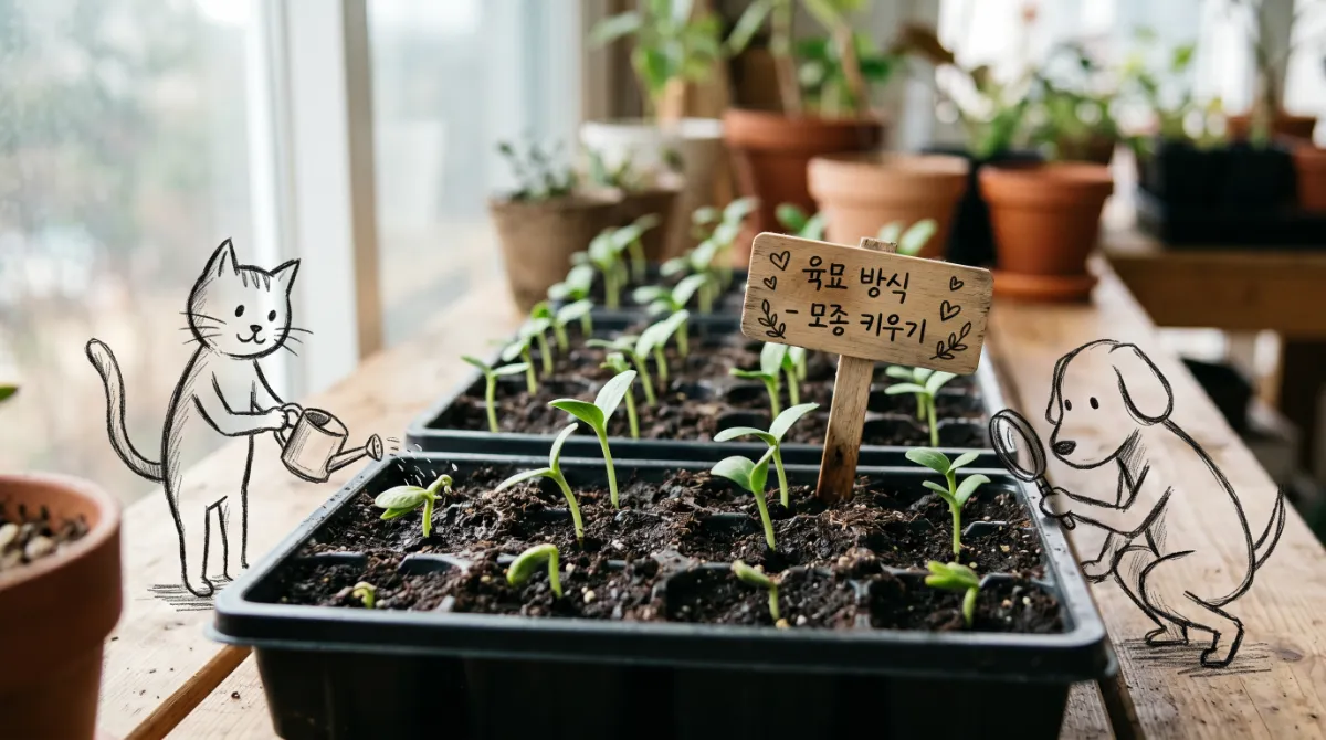 실내 육묘 시 빛이 부족하면 모종이 웃자라(줄기가 가늘고 길어짐) 정식 후 활착이 나빠집니다. 햇빛이 잘 드는 창가나 LED 보조등을 활용해주세요.