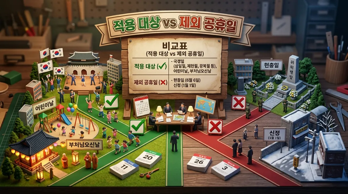 | 현충일, 신정(1월 1일) | 적용 제외 | 현행법상 대체공휴일 미해당 |