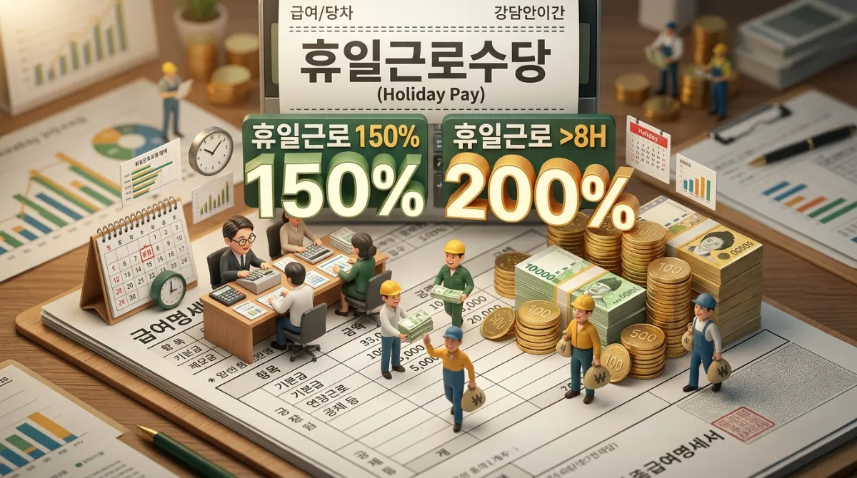 임금 형태에 따라 계산 방식이 조금 달라지는 부분도 있어요. 월급제는 유급휴일분이 이미 월급에 포함된 경우가 많아, 보통 추가로 휴일가산분(50%)만 더 계산합니다. 시급제·일급제는 유급휴일수당(100%) + 근로임금(100%) + 가산수당(50%), 합계 250% 구조로 적용돼요.