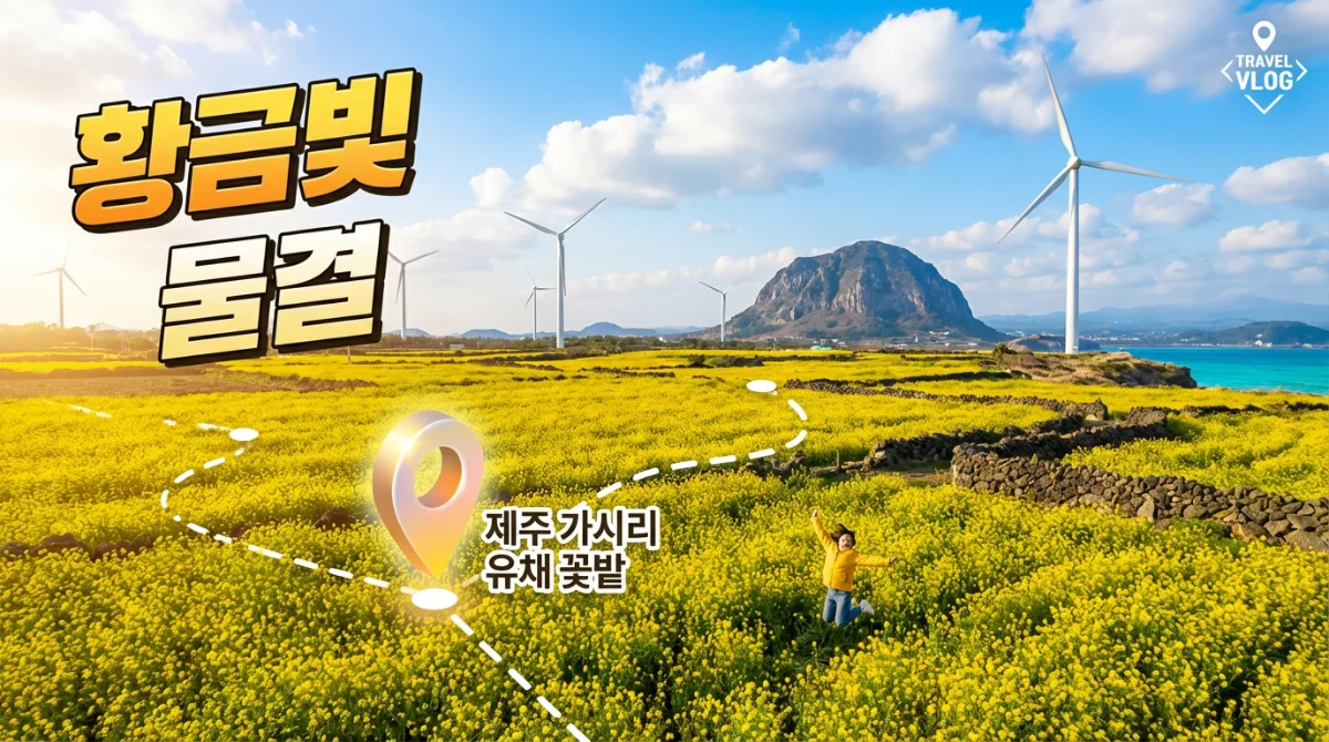 특히 가시리 풍력발전소 근처 유채꽃밭이나 웅장한 산방산을 배경으로 펼쳐지는 유채꽃밭은 그야말로 장관이죠. 푸른 바다와 노란 유채꽃, 그리고 제주의 돌담이 어우러져 이국적인 분위기를 자아냅니다. 파란 하늘 아래 활짝 핀 유채꽃 사이에서 점프샷을 찍거나, 드론을 활용해 광활한 유채꽃밭을 담아보는 것도 좋은 추억이 될 거예요.