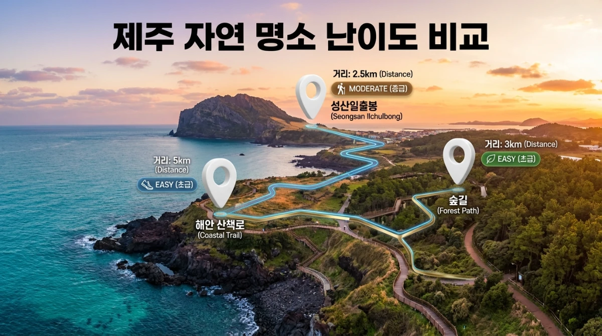 | 사려니숲길 (무장애길) | 왕복 약 1시간 | 매우 낮음 (평지) | 가족 단위, 힐링 목적 |