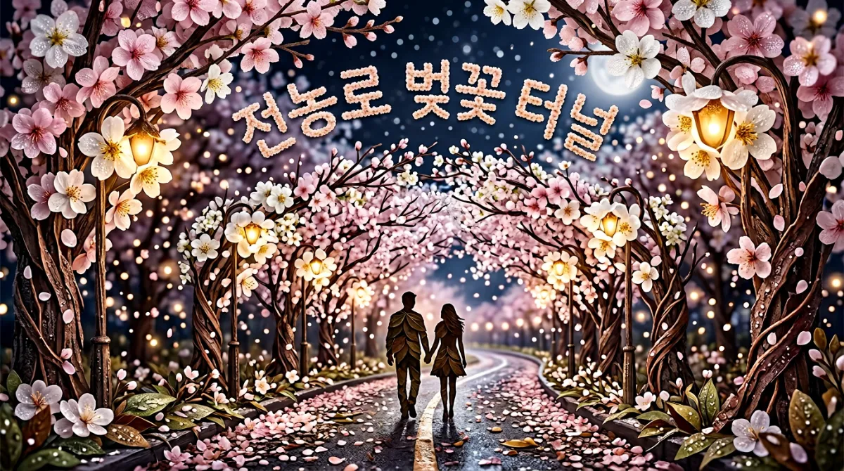 전농로는 낮에도 눈부시지만, 조명이 켜지는 밤이 되면 신비로운 분위기가 배가됩니다. 가로등 불빛을 받은 벚꽃이 마치 팝콘처럼 몽글몽글 피어오른 모습은 낭만 그 자체예요.