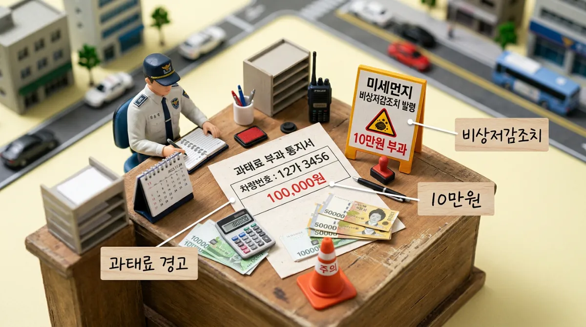 이를 어기면 10만 원 이하의 과태료가 부과될 수 있습니다. 또한 특정 지역(서울 한양도성 내 등)의 상시 운행 제한 구역을 위반하면 지자체 조례에 따라 더 높은 벌칙이 따를 수 있습니다.