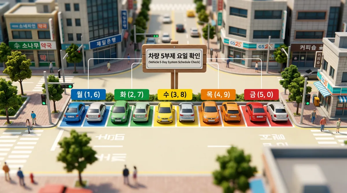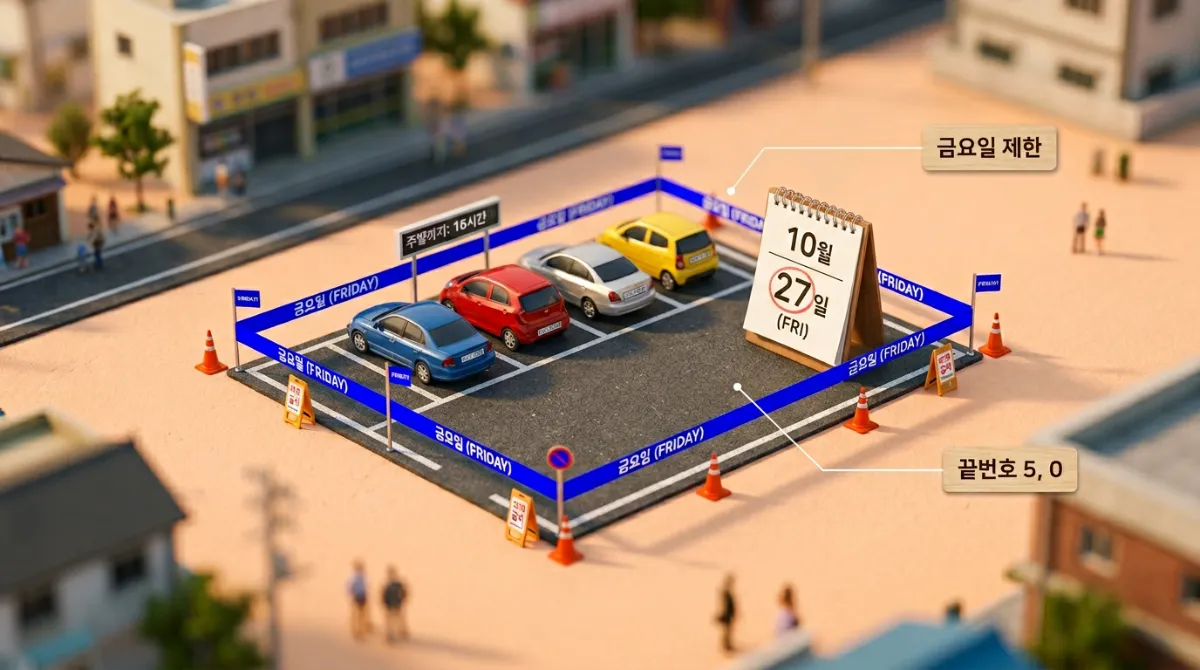 - 요일 확인법: 번호판 끝자리가 1·6(월), 2·7(화), 3·8(수), 4·9(목), 5·0(금)입니다.