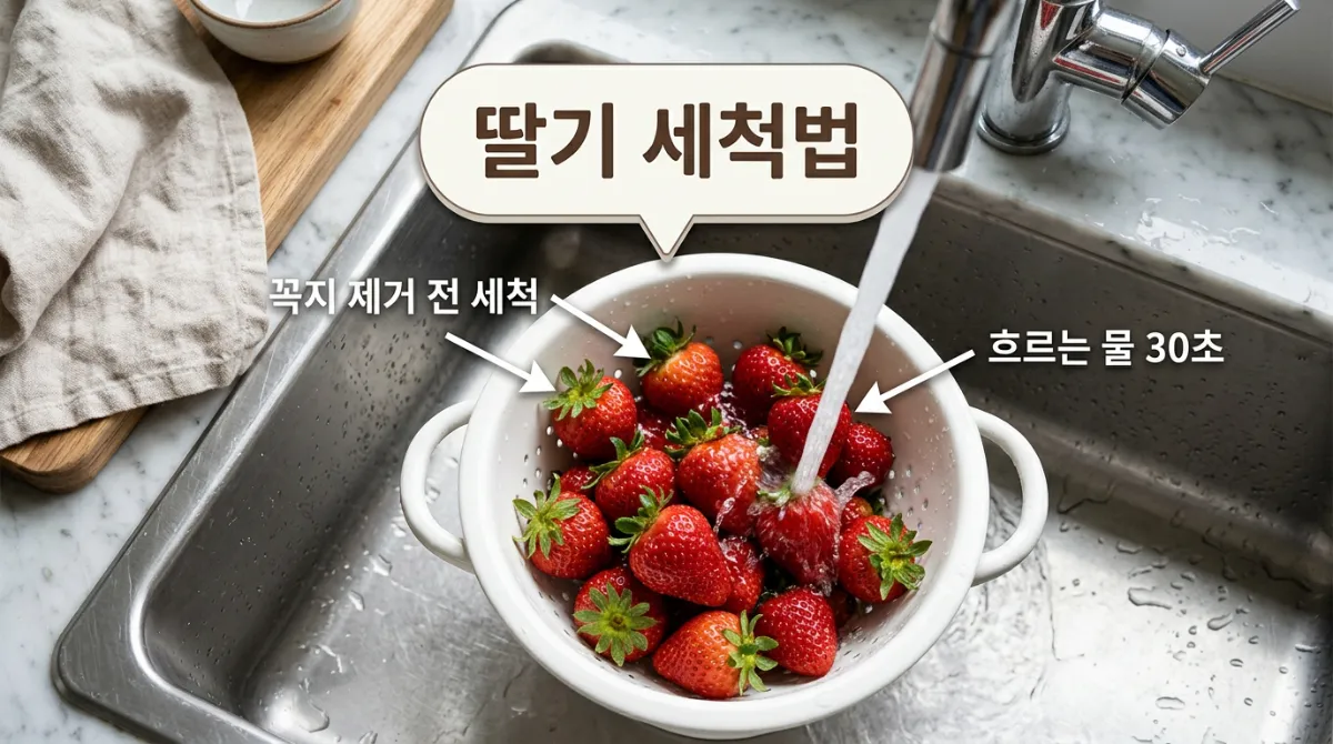 딸기는 꼭지를 제거하기 전에 씻어야 해요. 꼭지를 먼저 떼면 세척 시 물이 과육 안으로 들어가 영양소가 빠져나가고 맛이 물러질 수 있습니다. 흐르는 물에 30초~1분간 살살 헹구는 것이 가장 좋은 방법이에요.