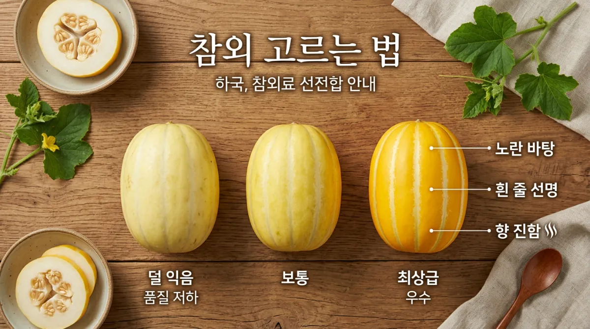 참외는 노란 바탕에 흰 줄기가 선명하고 고른 것이 좋아요. 꼭지가 싱싱하게 붙어 있고, 향이 진하게 올라오는 것이 잘 익은 참외입니다. 손으로 살짝 눌렀을 때 약간의 탄성이 있으면서 너무 딱딱하지 않은 것이 딱 좋은 숙성 상태예요. 줄기 부분이 달고 아랫부분은 덜 달기 때문에 꼭지 쪽부터 먹으면 더 달게 즐길 수 있습니다.
