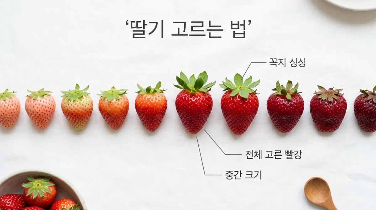 꼭지가 싱싱하고 초록빛이 진한 것이 신선한 딸기예요. 과육 전체가 고르게 붉고, 꼭지 바로 아래까지 빨갛게 익은 것이 가장 달고 맛있습니다. 너무 크고 빛이 과도하게 짙은 것보다 중간 크기에 선명한 빨간빛을 띤 것이 맛이 좋아요. 물기가 많고 곰팡이 흔적이 있는 것은 피하세요.