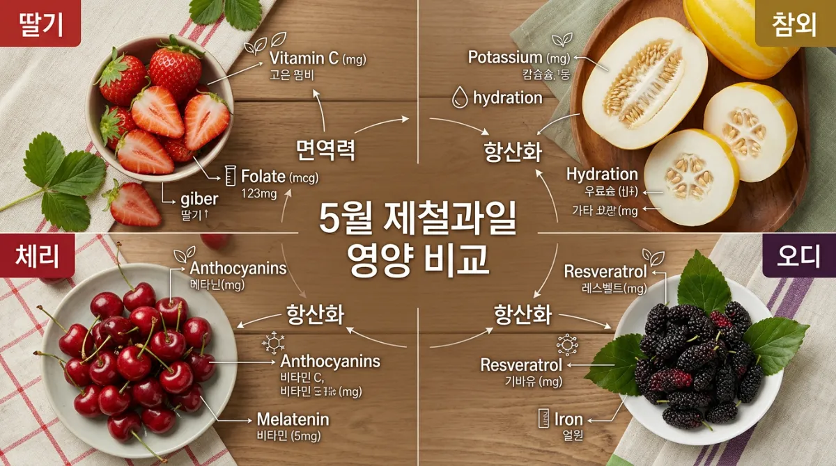 5월 제철과일들을 목적에 맞게 선택할 수 있도록 영양 비교와 추천 활용법을 정리했어요.