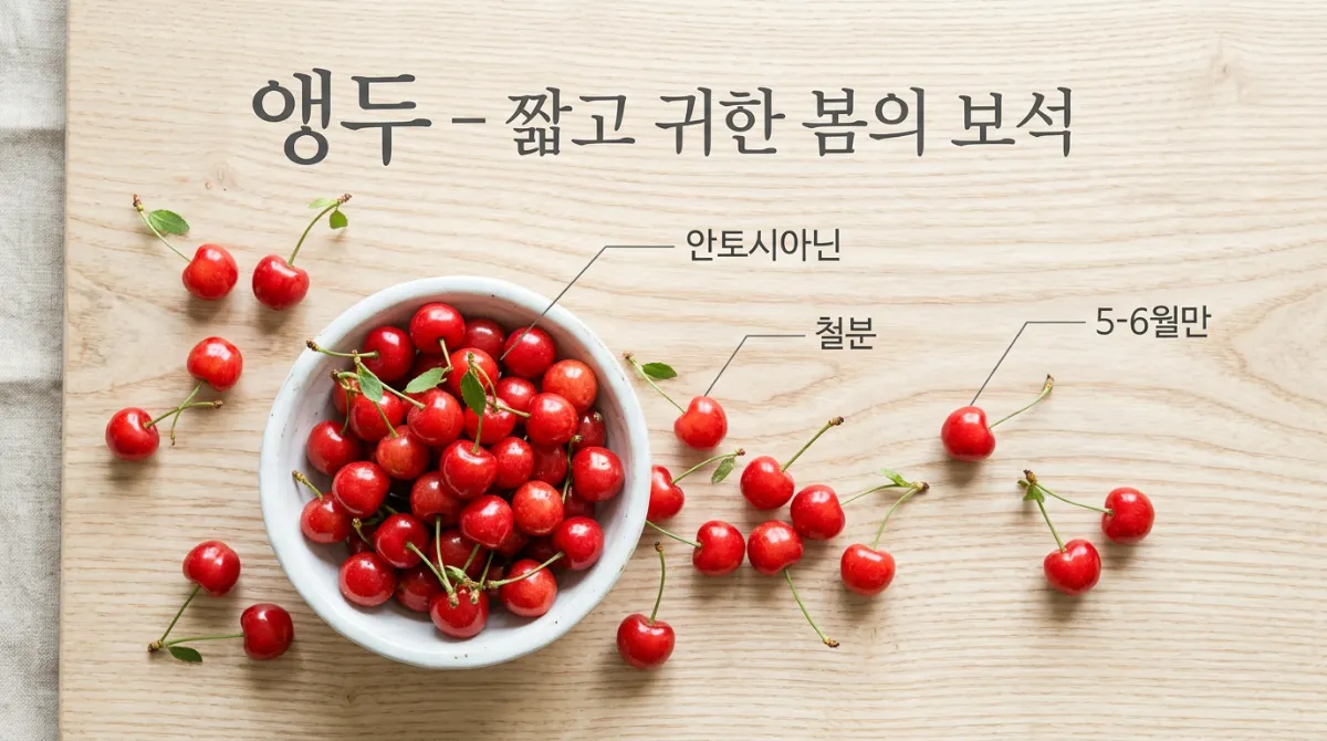 | 🍒 앵두 | 5월~6월 | 비타민 C, 안토시아닌, 철분 | 항산화·빈혈 예방·눈 건강 |