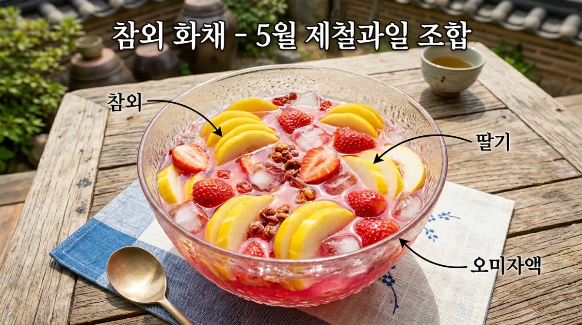 참외 화채: 참외 + 딸기 + 얼음 + 오미자액 → 5월 제철과일을 한 번에 즐길 수 있는 전통 화채입니다.