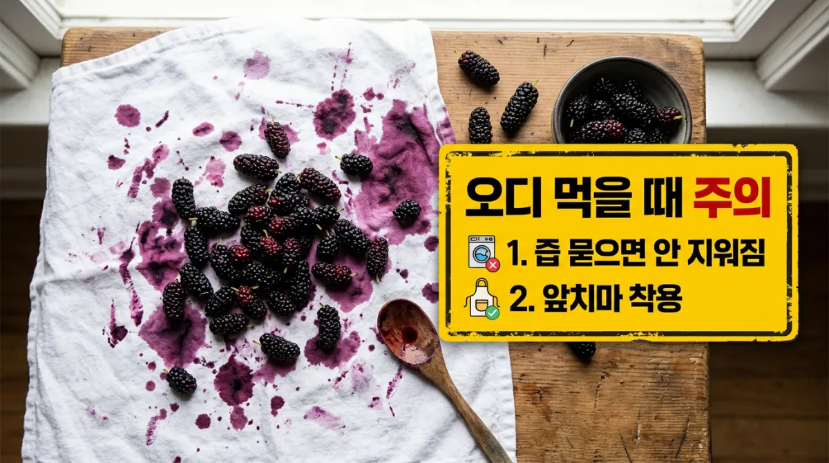 오디의 보랏빛 즙은 한 번 옷에 묻으면 잘 지워지지 않습니다. 먹을 때는 밝은 색 옷을 피하거나 앞치마를 두르는 게 좋아요. 아이들이 먹을 때는 특히 주의가 필요합니다. 씻을 때는 흐르는 물에 살살 헹궈 즙이 튀지 않도록 하세요.