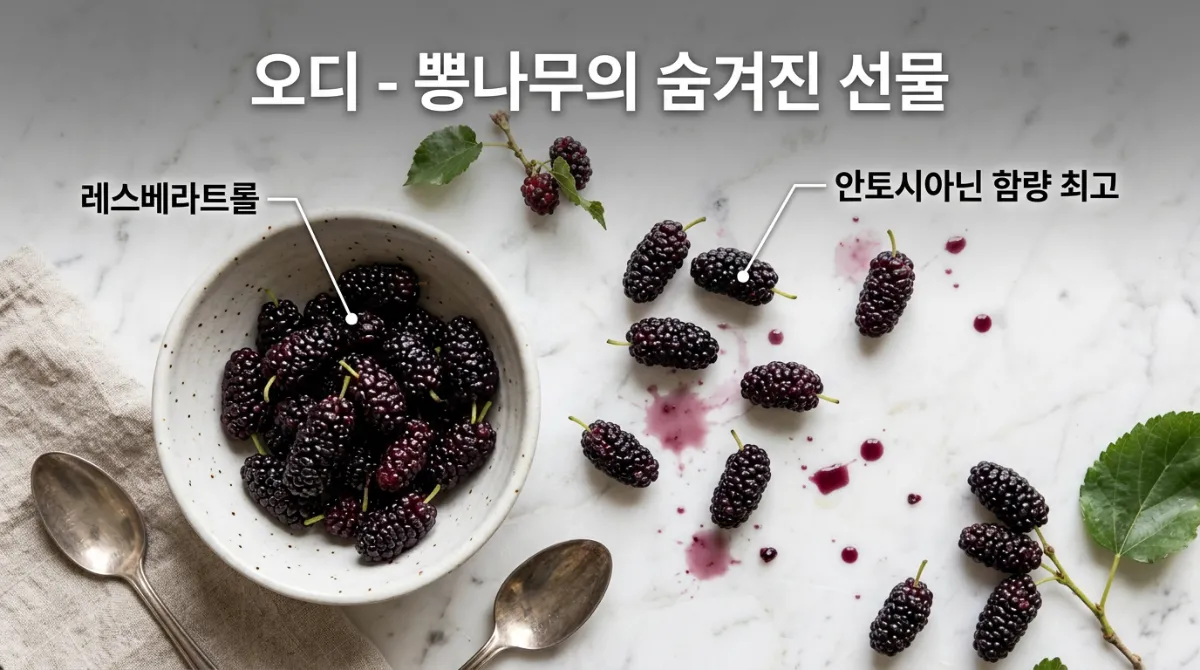 | 🫐 오디 | 5월~6월 | 레스베라트롤, 안토시아닌, 철분 | 노화 방지·혈관 건강·뇌 건강 |
