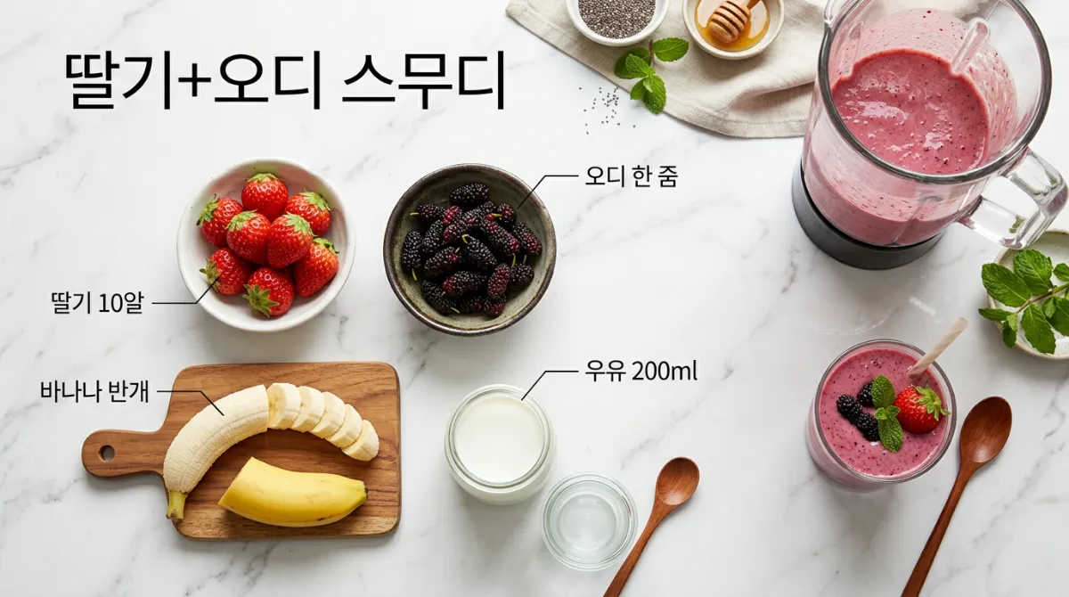 딸기 + 오디 스무디: 딸기 10알 + 오디 한 줌 + 바나나 반 개 + 우유 → 항산화 성분이 풍부한 봄 스무디. 색깔도 예쁘고 맛도 일품이에요.
