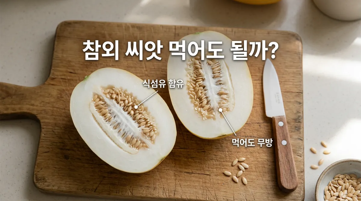 참외 씨와 주변의 하얀 태좌 부분은 먹어도 무방합니다. 다만 과육보다 수분이 많고 맛이 밍밍해 보통 제거하고 먹는 경우가 많아요. 씨앗에는 식이섬유와 리놀렌산이 소량 함유되어 있어 영양 면에서 나쁘지 않으니, 먹기 불편하지 않다면 함께 먹어도 괜찮습니다.