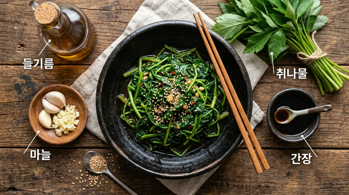- ✔ 조리법 — 데친 취나물을 들기름·간장·다진 마늘로 볶기