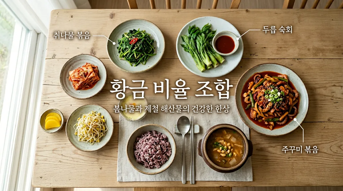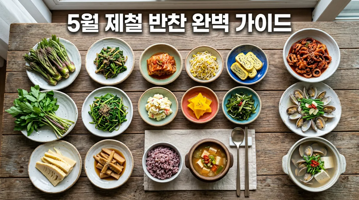나물류 2~3가지 + 해산물류 1가지 조합이 5월 밥상의 황금 비율이에요. 취나물 볶음 + 두릅 숙회 + 주꾸미 볶음 조합이면 영양도 맛도 모두 잡을 수 있습니다.