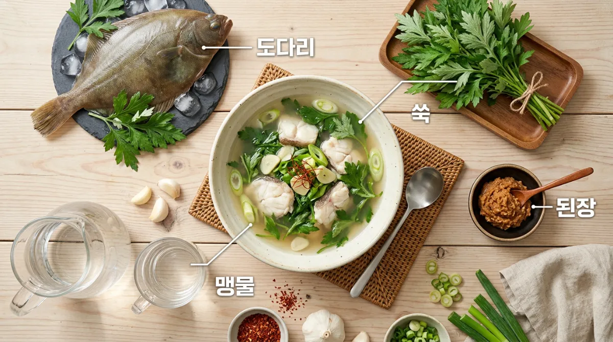 - ✔ 조리법 — 맑은 물에 도다리 넣고 끓이다 쑥과 된장 약간 풀기