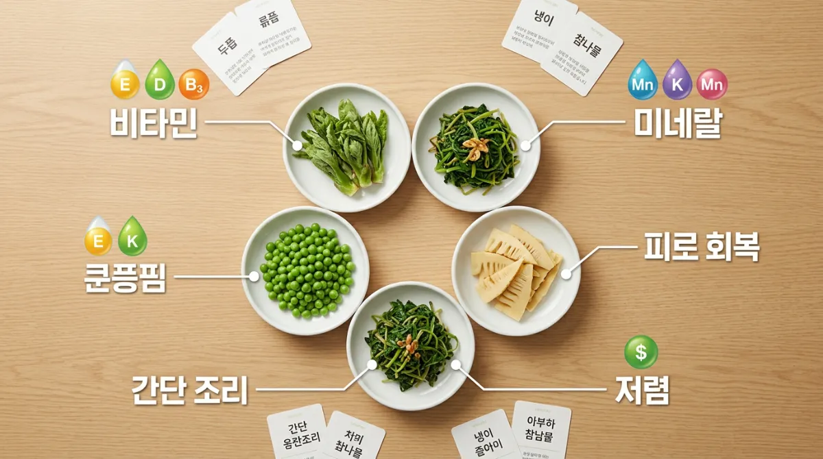 두릅, 취나물, 죽순, 쑥, 냉이처럼 봄에만 나오는 나물들로 만드는 반찬이에요. 비타민과 미네랄이 풍부하고 향이 강해서 밥 한 공기를 뚝딱 비우게 만드는 힘이 있습니다. 조리법이 비교적 간단해서 나물 무침 한 가지만 해도 훌륭한 반찬이 돼요.