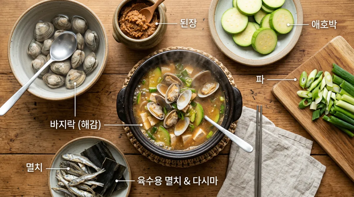 - ✔ 된장국 — 바지락 + 애호박 + 된장 기본 구성
