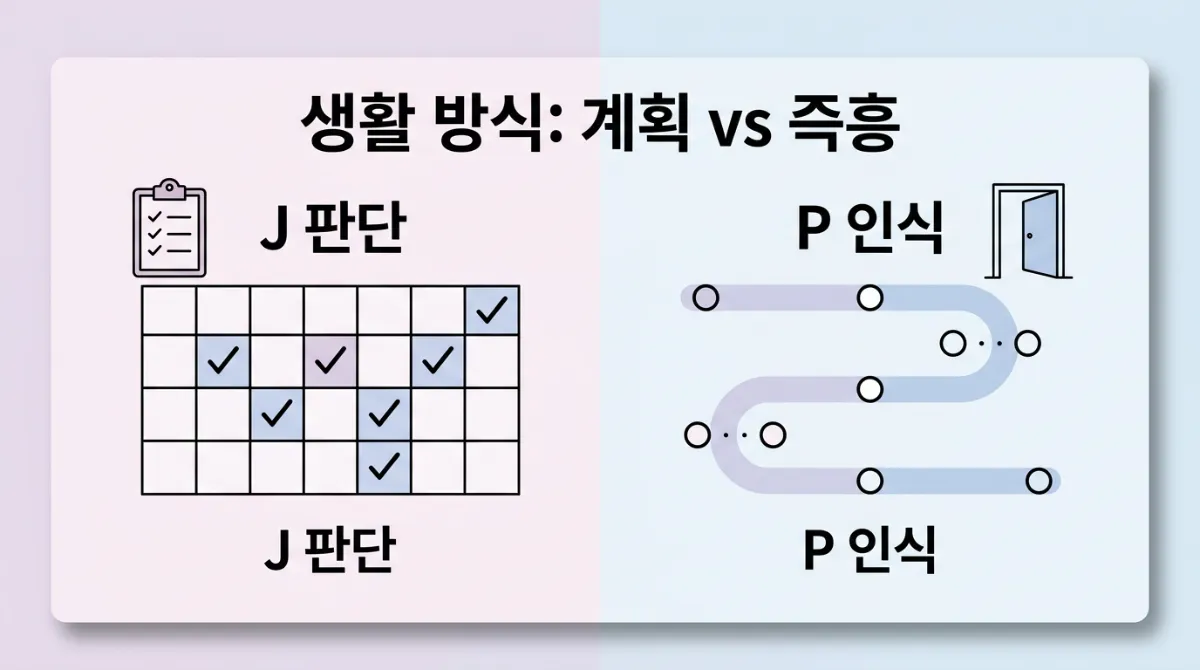 | 생활 방식 | J (판단) | P (인식) | 계획적이고 체계적으로 사는가, 유연하고 즉흥적으로 사는가 |