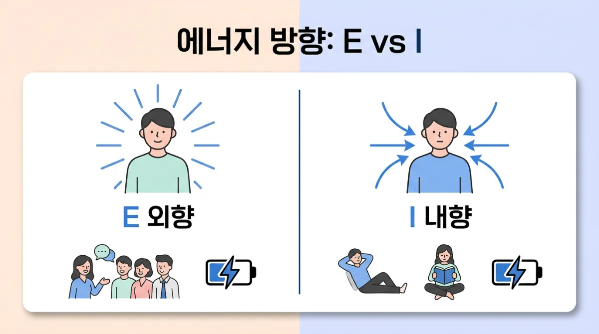 | 에너지 방향 | E (외향) | I (내향) | 에너지를 외부 세계에서 얻는가, 내면에서 얻는가 |