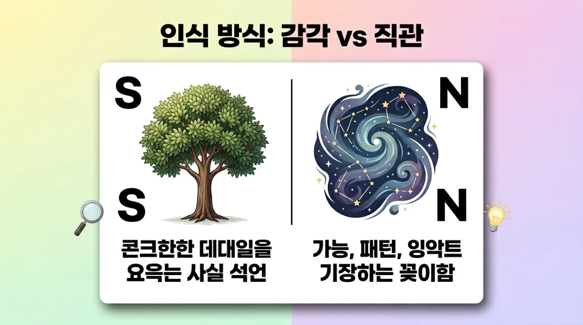 | 인식 방식 | S (감각) | N (직관) | 현실적 사실을 중시하는가, 가능성과 패턴을 중시하는가 |