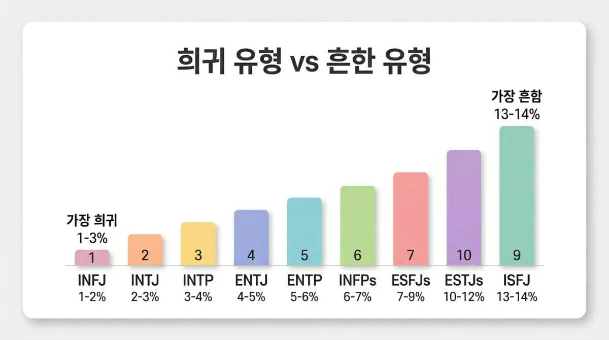 가장 희귀한 유형: INFJ (전 세계 인구의 약 1~3%) — 통찰력과 공감 능력이 뛰어나지만 극도로 드문 유형