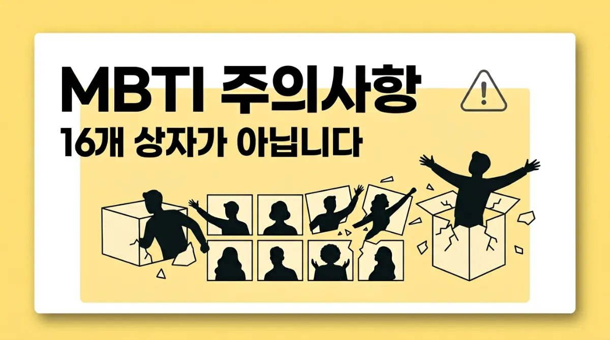 MBTI는 사람을 16개 상자 중 하나에 집어넣는 도구가 아닙니다. 같은 INFP라도 성장 환경, 경험, 가치관에 따라 전혀 다른 사람일 수 있어요. "넌 ENFP니까 이럴 거야"처럼 유형으로 사람을 단정 짓는 건 MBTI를 잘못 활용하는 대표적인 예입니다. 자기 자신을 이해하는 출발점으로 활용하는 것이 가장 바람직합니다.