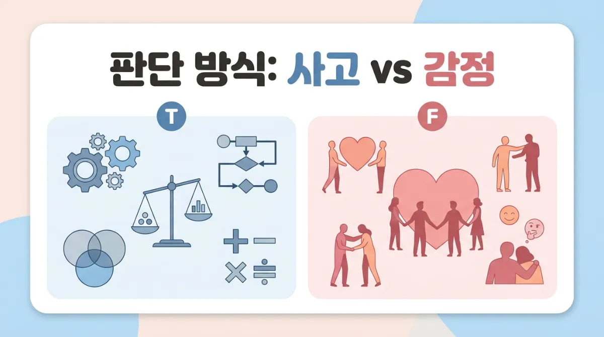 | 판단 방식 | T (사고) | F (감정) | 논리와 객관성으로 결정하는가, 가치와 감정으로 결정하는가 |