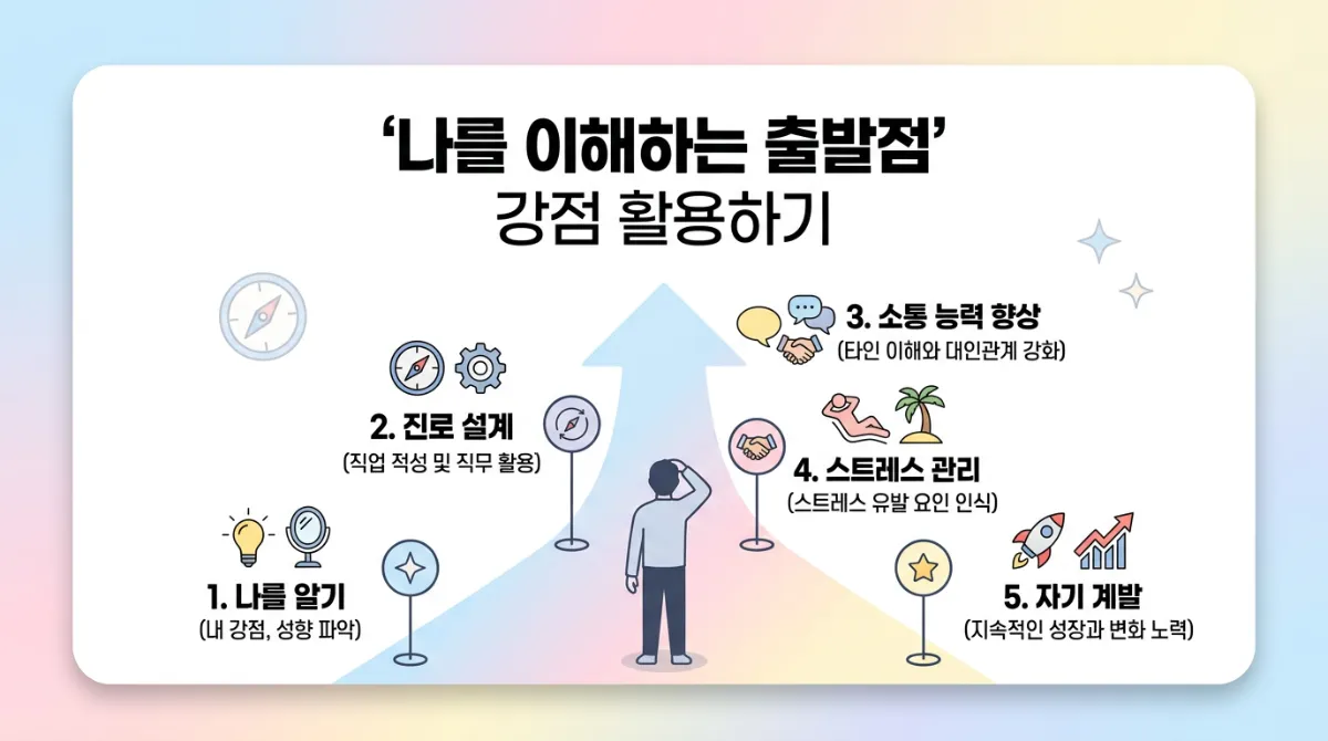 MBTI는 나를 이해하고 타인을 이해하는 데 꽤 유용한 도구예요. 다만 유형 결과를 너무 고정된 틀로 받아들이기보다는 "나는 이런 경향이 있구나"라는 출발점으로 가볍게 활용하는 게 가장 건강한 방식이라고 생각합니다. 내 유형을 알았다면, 이제 그 유형의 강점을 어떻게 살릴지 고민해보는 것도 재미있는 일이에요.